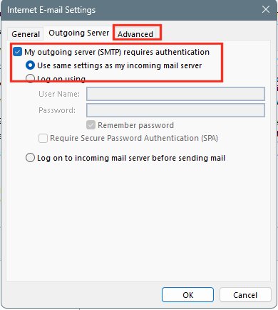 Marque la opción "Mi servidor de envío (SMTP) requiere autenticaación" y después cambiamos a la pestaña de "Avanzado"
